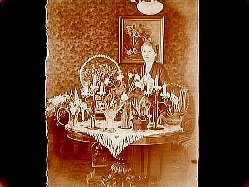 Rumsinteriör, en kvinna. Fru Hilda Lindskog på 50 årsdagen.
