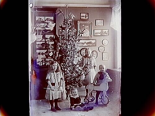 Rumsinteriör, fyra barn runt julgranen.