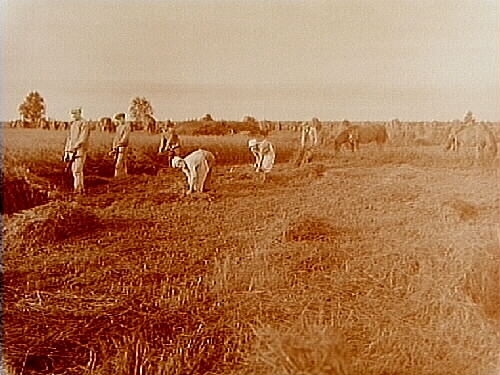 Skördearbete. 3 män med liar och 2 kvinnor och en man som binder kärvar.