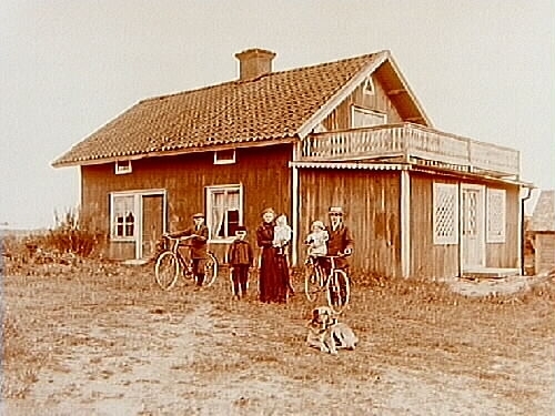 6 personer framför huset, 2 av dem med cyklar.
