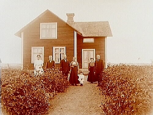 Vinkelbyggt en och en halvvånings bostadshus, 6 vuxna och ett barn framför huset.