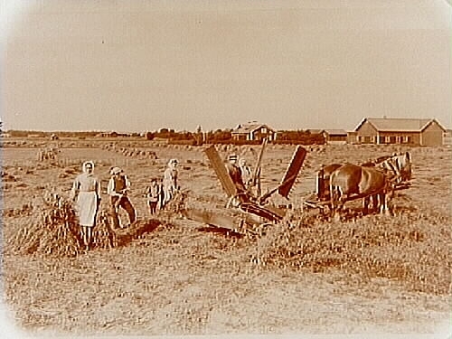 Skördearbete, 2 hästar spända för skördemaskin, 6 personer i arbete med skörden.
