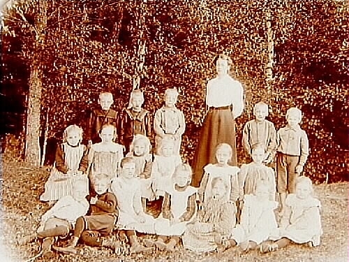 Bäcketorps skola, 18 skolbarn med lärarinna Maria Holmgren.