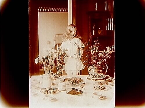 Liten flicka vid kaffebordet, rumsinteriör.
