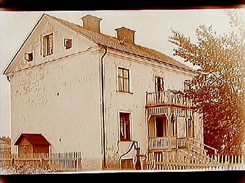 Tvåvånings bostadshus med balkong och förstubro.
