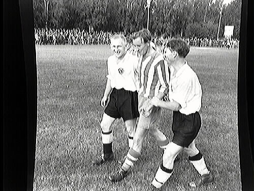 'Fotboll. Klämmen' Pettersson och Åke Engvall lämnar planen efter matchen.