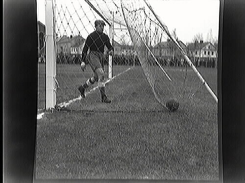 Fotboll. Berndt Karlsson hämtar ut bollen ur mål.