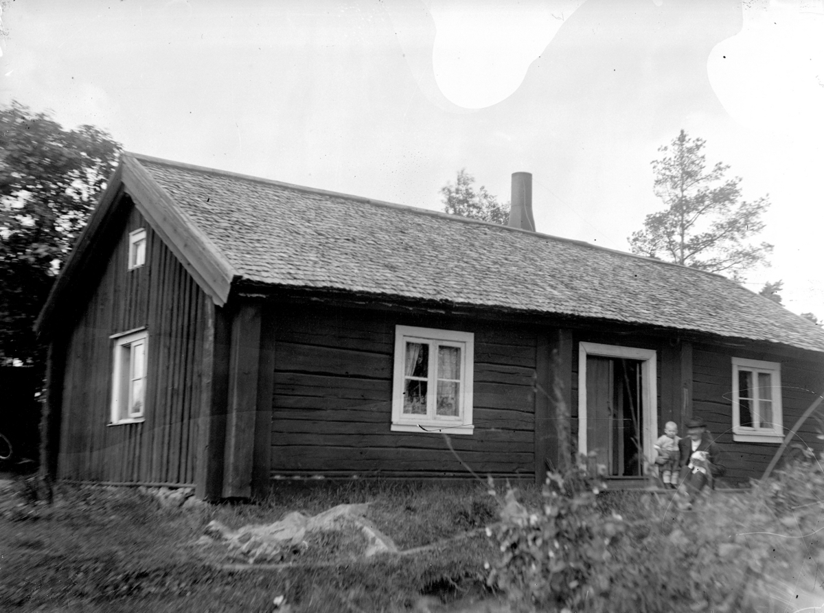 Bostadshus, en man och ett litet barn.