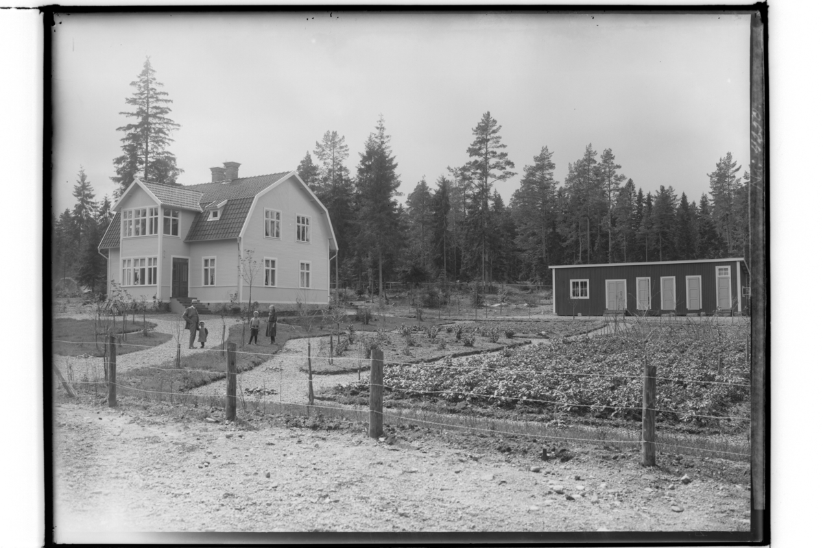 Tvåvånings villa med brutet tak, uthus, 4 personer i trädgården.
