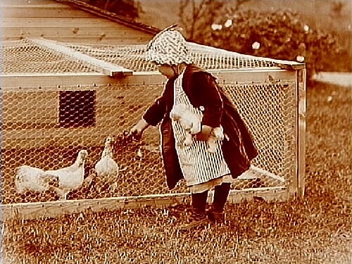 En liten flicka vid kycklingburrar.