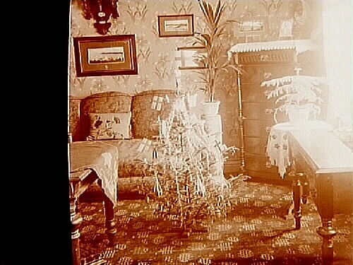 Titel: Rumsinteriör, julgran. Sam Lindskogs familjebild. Två bilder på samma glasplåt.