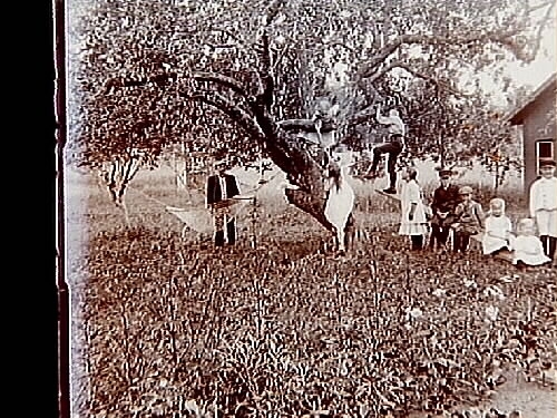Titel: Tio personer i trädgården, bostadshus i bakgrunden. Sam Lindskogs familjebild. Två bilder på samma glasplåt.