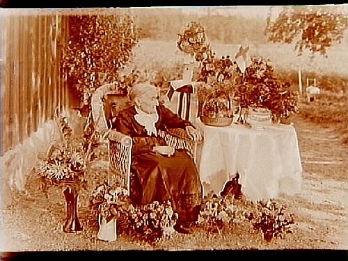 Äldre kvinna i korgstol, Kristina Olssons 100 årsdag.