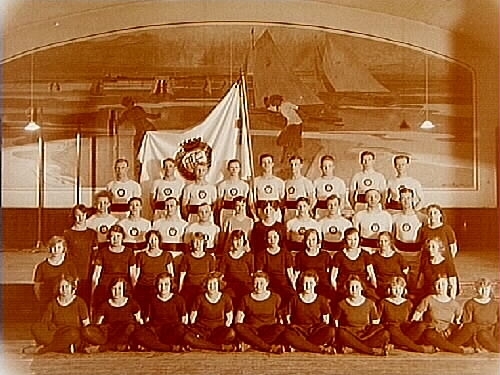 Gymnastikgruppen A.G.F. i gymnastiksalen, 23 kvinnor och 18 män.
