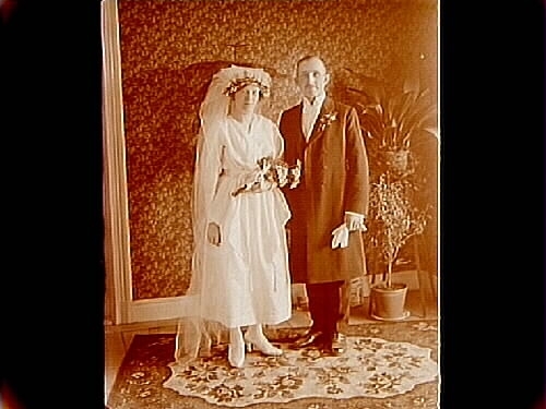 Titel: Brudpar, bruden helt i vitt med lång slöja, myrtenkrans och brudbukett, brudgummen i bonjour och vita handskar. Elof Johansson