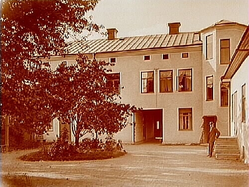 Tvåvånings bostadshus med trapphus, en man på gården.