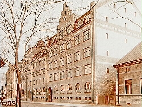 AB Skofabriken Kronan, fyravånings fabriksbyggnad i tegel med frontespis.