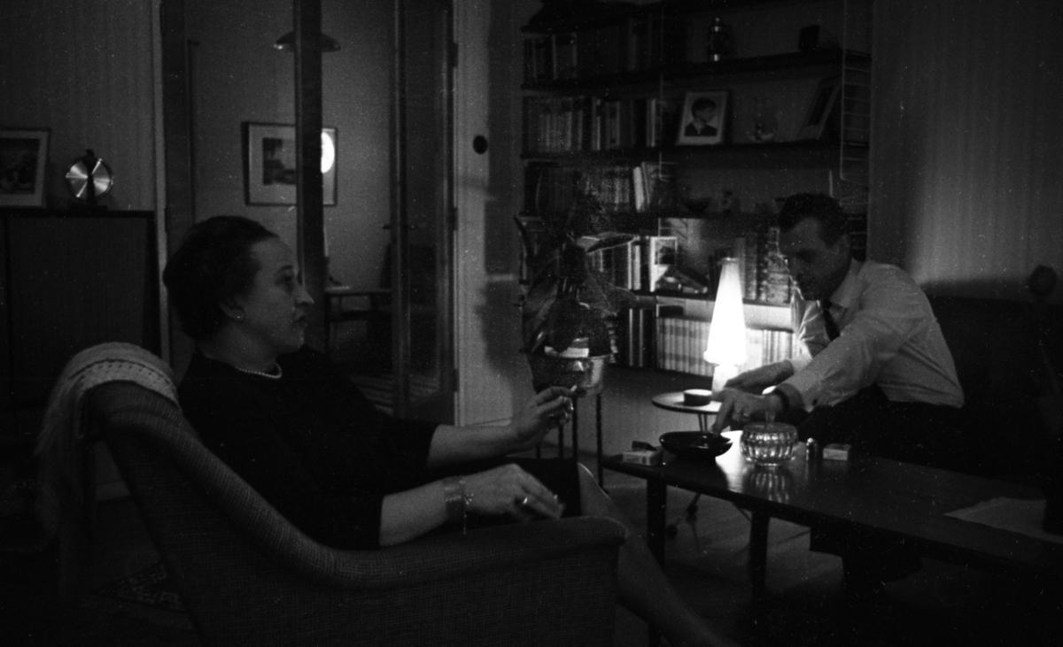 En kvinna sitter i en fåtölj i ett vardagsrum. Hennes man sitter mittemot henne i en soffa. På ett bord som står emellan dem ligger bl.a. ett askfat samt en glasskål med lock. En golvlampa lyser i bakgrunden. Bkom denna syns en bokhylla invid väggen.