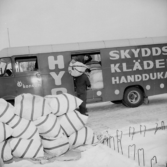 Bil med texten: "Hyr skyddskläder, handdukar", lastning, två män.