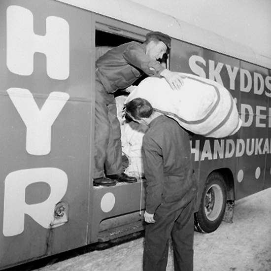 Bil med texten: "Hyr skyddskläder, handdukar", lastning, två män.