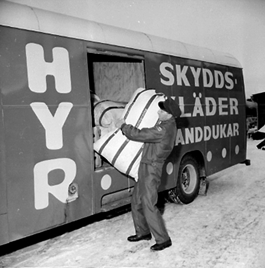 Bil med texten: "Hyr skyddskläder, handdukar", lastning, en man.