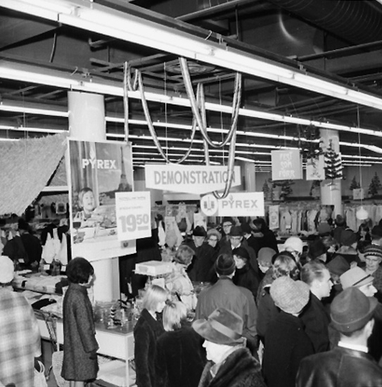 Konsum Domus, affärsinteriör, kunder och personal, demonstration av Pyrex-produkter.