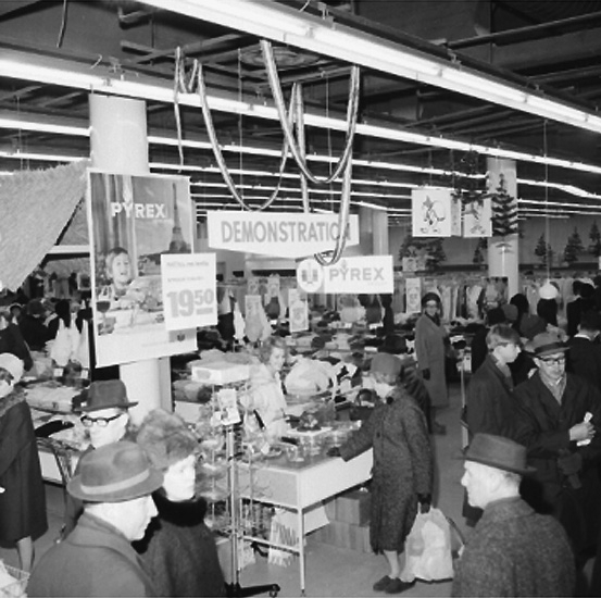 Titel: Konsum Domus, affärsinteriör, kunder och personal, demonstration av Pyrex-produkter.