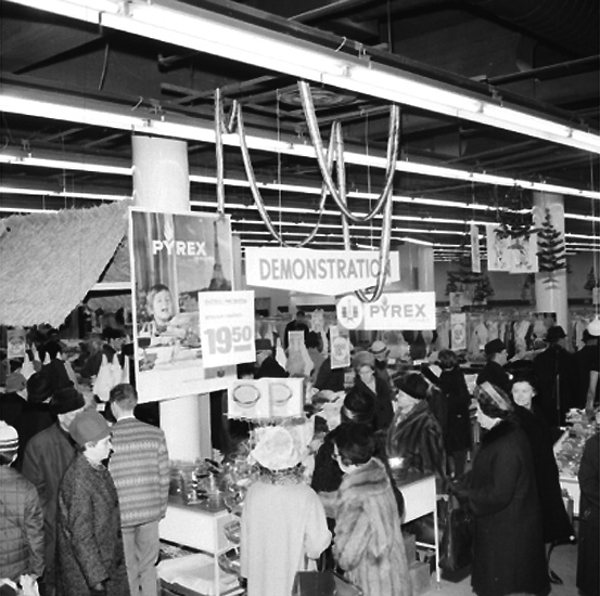 Konsum Domus, affärsinteriör, kunder och personal, demonstration av Pyrex-produkter.