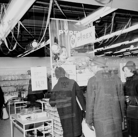 Titel: Konsum Domus, affärsinteriör, kunder och personal, demonstration av Pyrex-produkter.