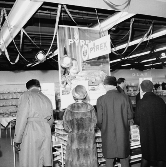 Titel: Konsum Domus, affärsinteriör, kunder och personal, demonstration av Pyrex-produkter.