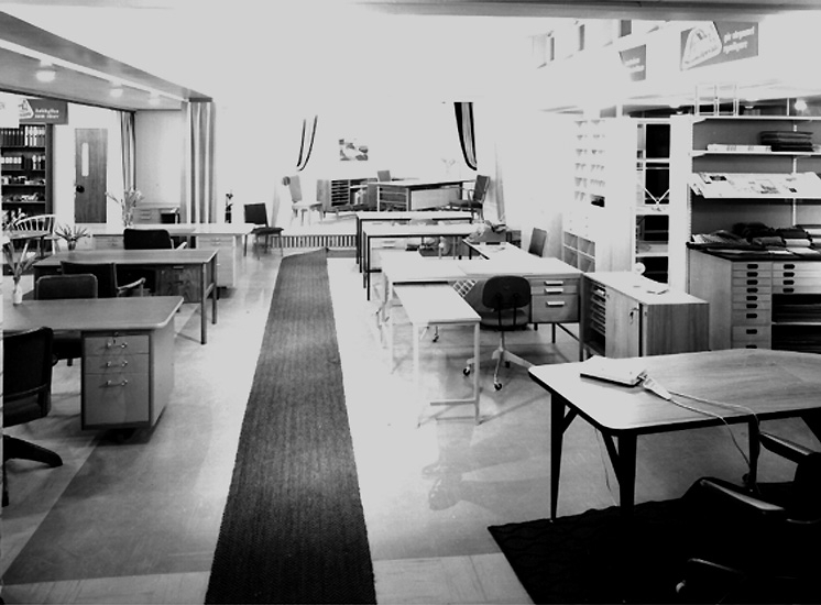 Rumsinteriör, kontorsmöbler och kontorsmaskiner.