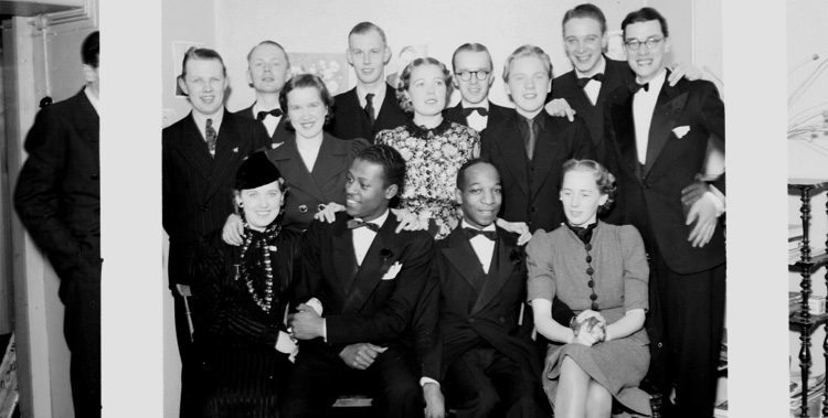 "Happy" Mitehner och Roger Boyd på besök i "Knuttes" källarateljé, efter Edgar Hayes konsert på Örebro Konserthus och sedan saxtrion gjort en bejublad "sit in" i Whispering på Sportpalatset. Ten. saxen Joe Garland saknas på bilden.