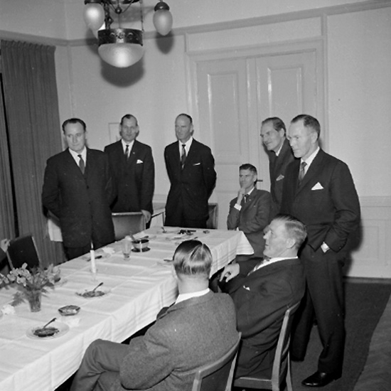 Titel: Rumsinteriör, grupp vid bordet. UB, 30-årsjubileum.