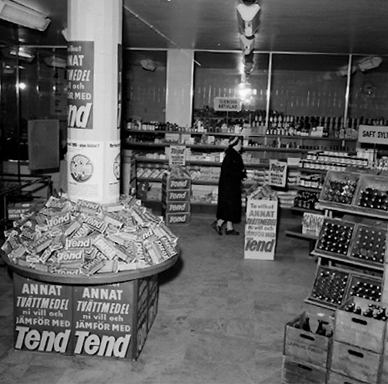 Konsum, affärsinteriör, tvättmedel Tend, en kvinna.