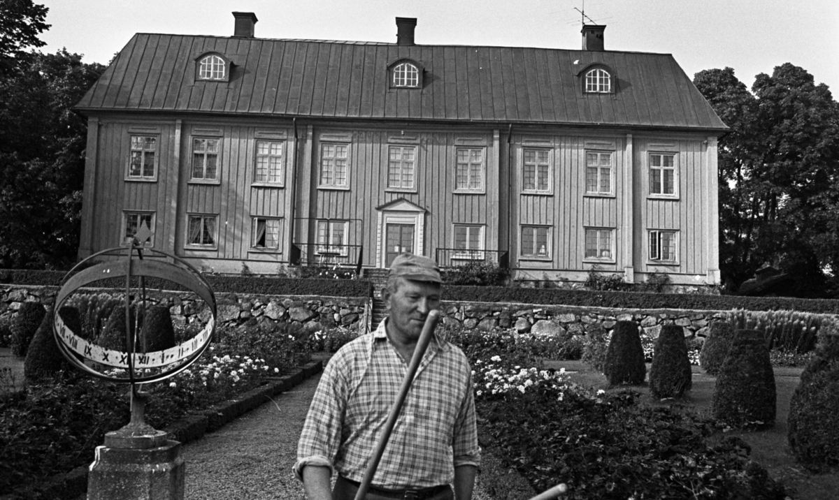 I förgrunden syns en trädgårdsmästare. Bredvid honom står ett solur. Bakom honom syns en trädgård. I bakgrunden längre bort syns Hasselfors bruksbostad. En trappa i två avsatser som leder upp mot huset syns även samt längre fram i bilden några konstfärdigt klippta buskar till höger.
