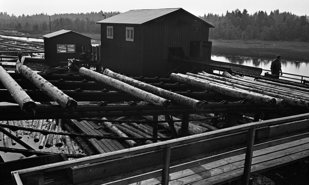 Timmerstockar som tagits upp ur vattnet transporteras på band på Hasselfors bruk. Två arbetare syns på bilden. I bakgrunden syns två magasinsbyggnader.