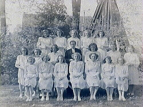 18 konfirmander, 18 flickor och pastor Hedberg.