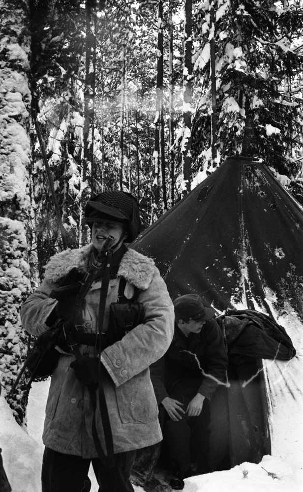 Två soldater under en militärövning. Soldaten i förgrunden har en vit överrock ovanpå sin militäruniform samt ett gevär i sin högra hand. Soldaten i bakgrundenär i färd med att kliva ut ur ett militärtält. Det har snöat mycket.