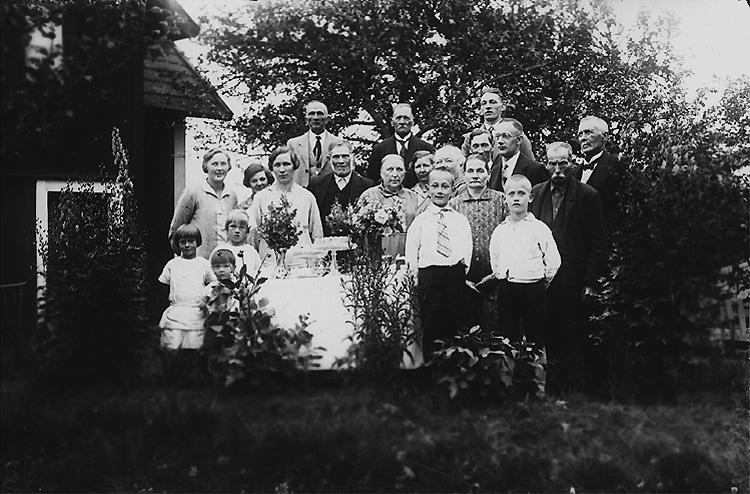 Familjen Gustafsson i Lövsätter med besökare från Norrbyås, bl.a. lärare Elander, Fridhem, till höger, med fler.