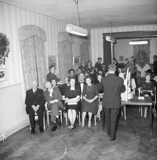 Titel: Rumsinteriör, grupp. Olle Carlbergs 50-årsfest i Arbetarföreningens lokal (ÖAF) på Slottsgatan.