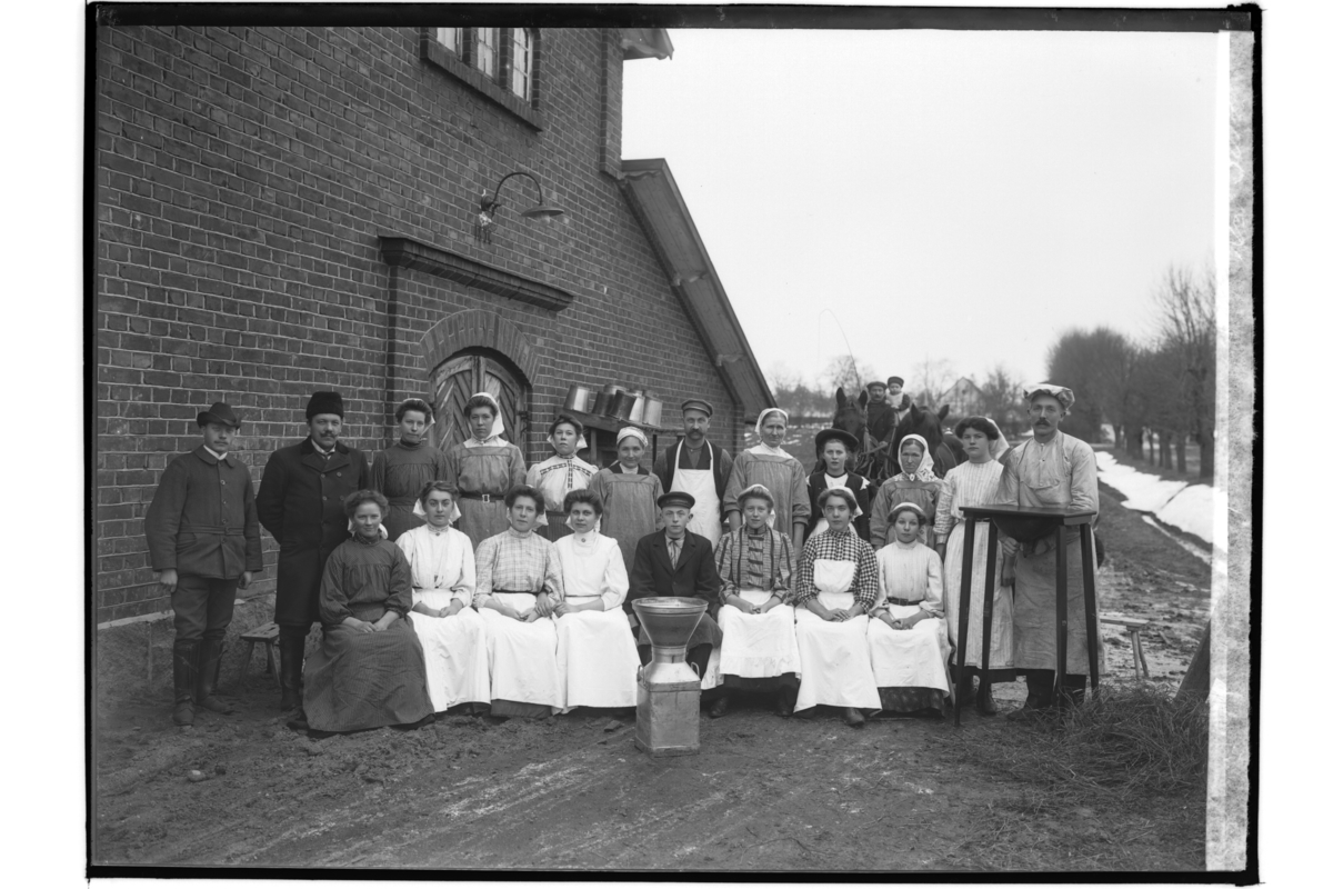 Mjölkningskurs, 22 personer. Ett par hästar.