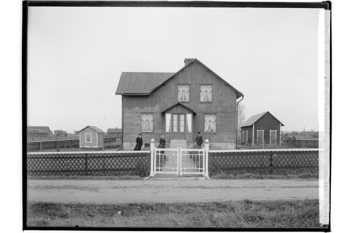 En och en halvplans vinkelbyggt bostadshus med glasad förstebro, 3 personer framför huset.