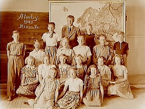 Almby Östra skola, klassrumsinteriör, 17 skolbarn med lärare Albert Johansson, klass 7a.