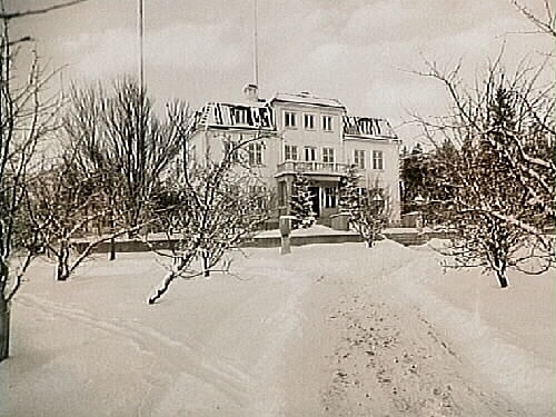 Tvåvånings villa med inredd vind, frontespis, balkong, brutet tak.