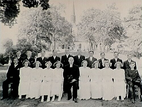 Konfirmander, 8 flickor, 12 pojkar och kyrkoherde Skjöldebrand.