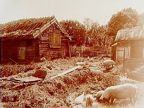 Svin och svinhus. 2 st ålderdomliga ekonomibyggnader, knuttimrade, med vasstak.