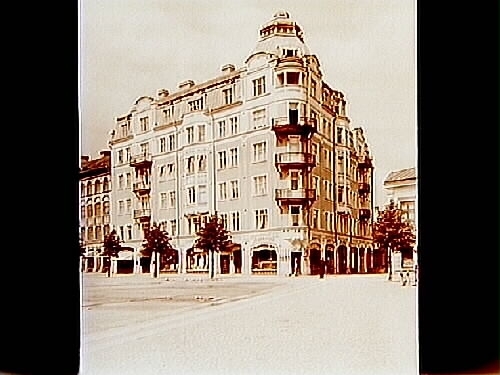Stenhus i fem våningar med jugendpräglad fasad i beige och rosa slätputs.