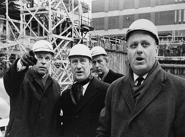 Vägbolaget, byggets entreprenör, pekar. Övriga i skyddshjälm är fr.v.