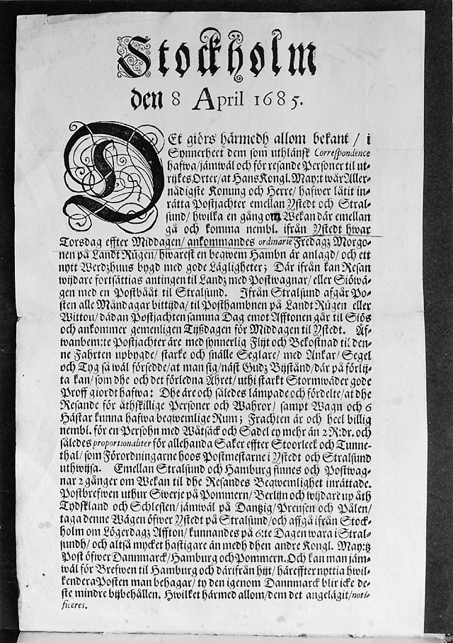 Stockholm den 8 april 1685. Om upprättande av post- och