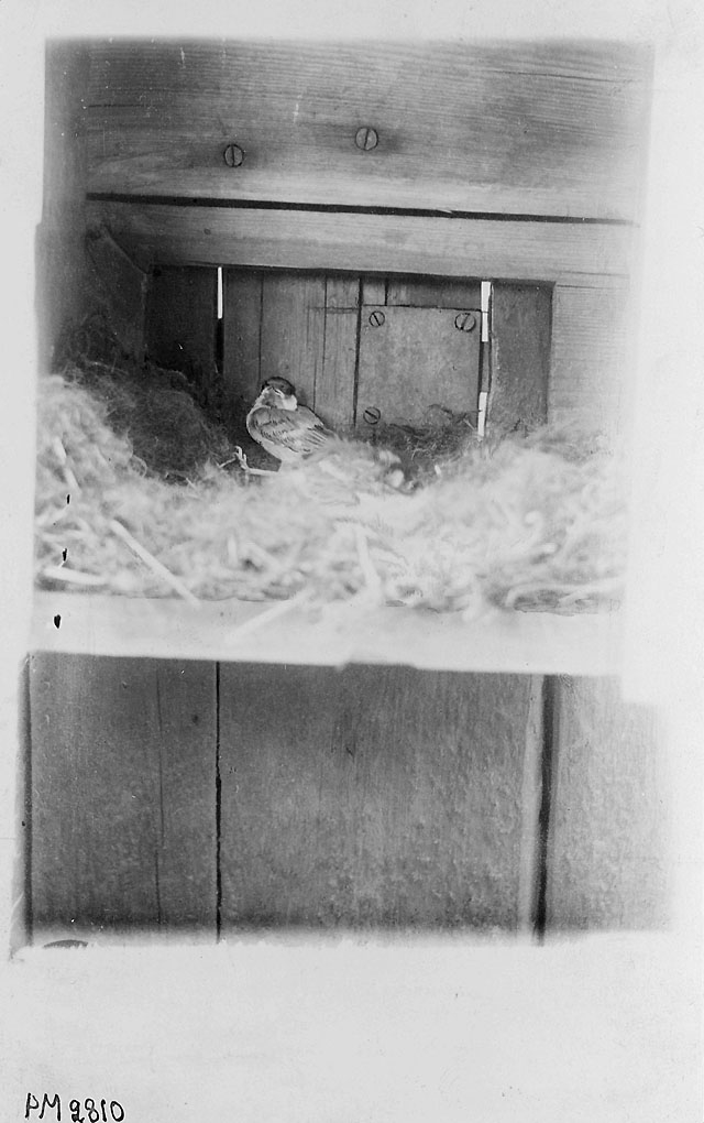 ena sidan om det plank, vari brevlådan är anbragt och hämtas på andra sidan. I lådan har en fågel sitt bo sedan 2 år tillbaka.